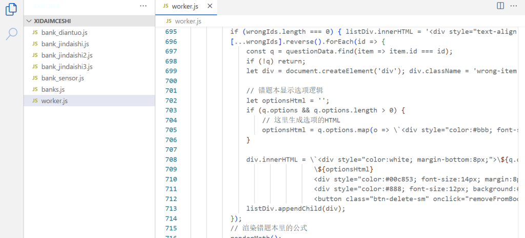 worker.js:只负责逻辑处理和页面渲染,完全不用动。banks.js:作为“管理员”,负责注册和管理不同的题库。bank_sensor.js/bank_history.js:每个学科一个独立文件。